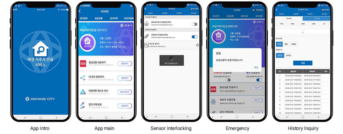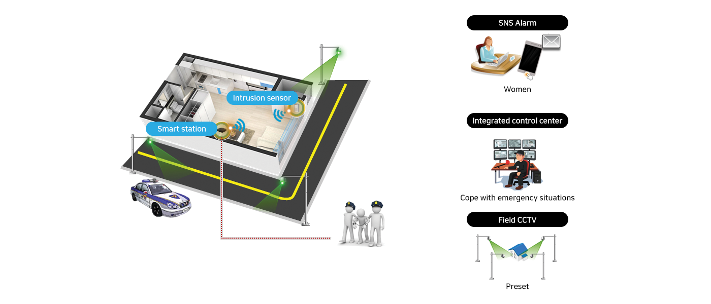 It is a service that collects intrusion information from outsiders through intrusion and motion detection sensors in the residential area and sends intrusion information to SMS alarm information and integrated control center so that the number of single female population can prevent sexual crimes and violence against women and respond immediately in case of an emergency.