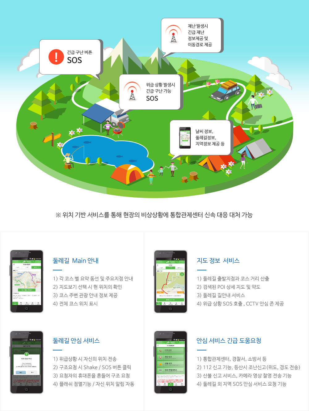 모바일 위치기반 서비스로 단순 지식 정보전달에서 벗어나 코스 정보 안내(네비게이션) 및 긴급 SOS 기능, 둘레길 내 정보검색 기능, 날씨 정보 등을 제공함으로서 편의성 제공은 물론 시민의 안전을 우선하는 서비스