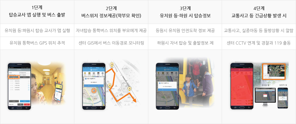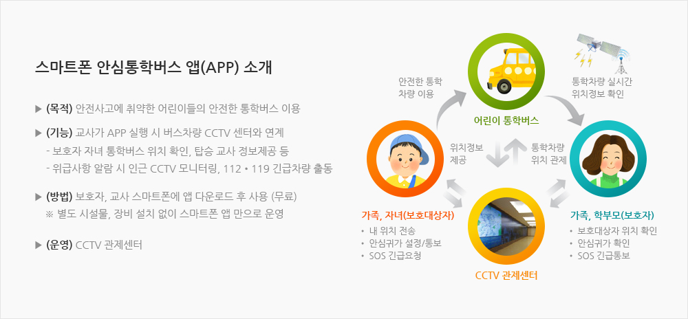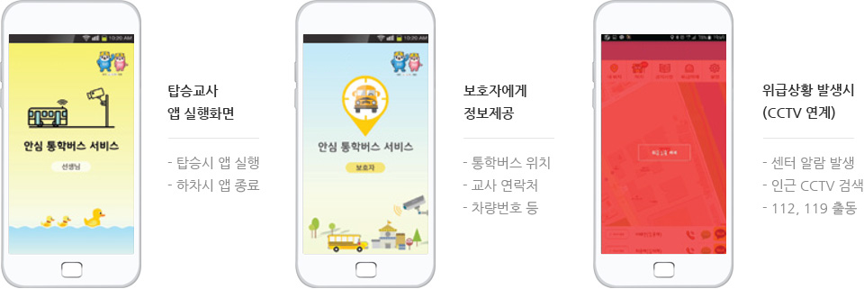 통학차량 운전자의 스마트폰 위치정보를 통해 실시간으로 보호자에게 차량의 이동 정보를 제공하고 미리 설정된 지역 범위에 도착했을 때 알림 서비스를 제공