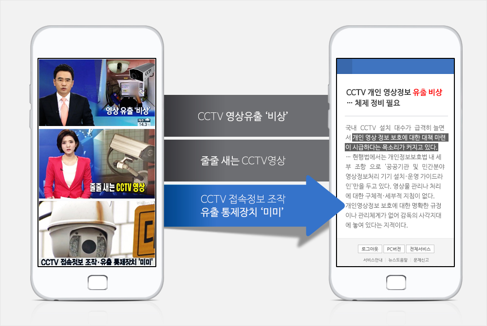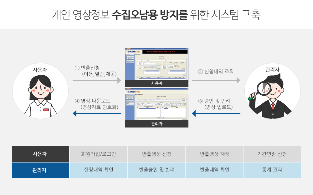 CCTV 영상자료가 외부로 무단 유출되는 것을 통제하는 영상 반출 서비스로, 반출된 파일이 불법 확산되지 못하도록 차단/관리하는 영상자료 전용 보안 서비스